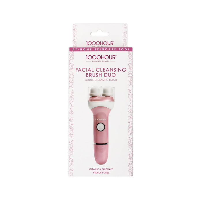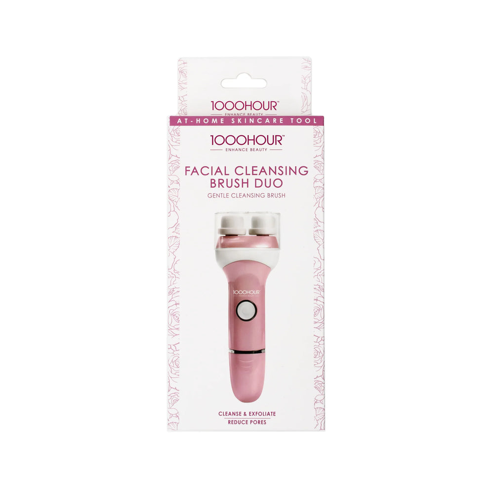1000HOUR FACIAL CLEANSING BRUSH DUO cleanses and exfoliates to reveal brighter and more radiant skin. Dual brush heads rotate in different directions to massage and cleanse the skin effectively.