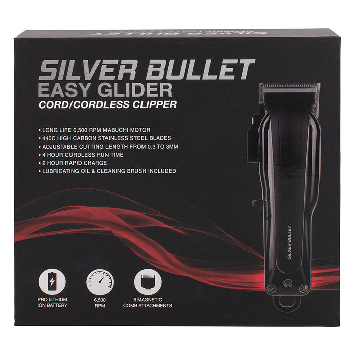 Get unbeatable precision with the high-performance Silver Bullet Easy Glider Cord Cordless Hair Clipper. Featuring self-sharpening, solid stainless steel blades, the secret is all in the motor. The heavy-duty motor provides unbeatable professional power with durability and reliability. This clipper has the power you demand and more! Silver Bullet. Closer. Faster. Better.