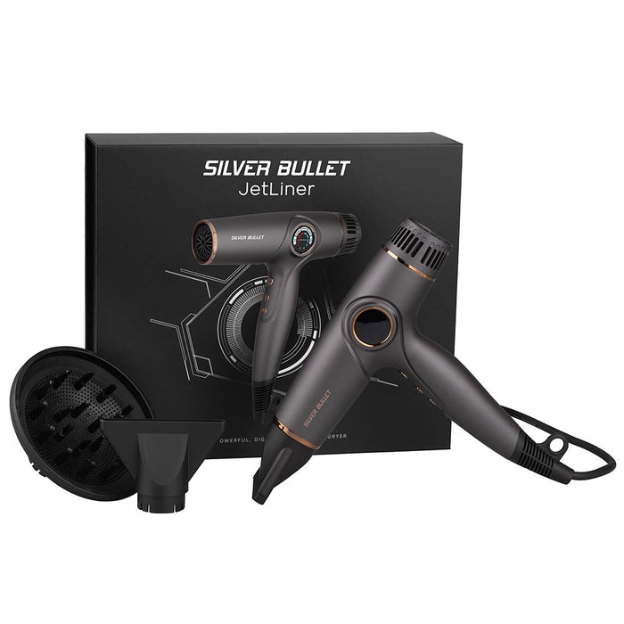 Ultra-powerful, amazingly lightweight and digital. Fly high on incredible performance with Silver Bullet JetLiner Hair Dryer. This futuristic hair dryer features a 105,000 rpm, 1800 watt, brushless DC motor. Five dial-in modes: fine, normal, coarse, manual and turbo boost, ensuring a setting for every hair type and every styling need. 3 speed/3 heat settings in manual mode, as well as a cool shot function. Ionic generator for smoother, shinier, frizz-free hair. Super lightweight at only 348 grams. With streamlined appearance, Silver Bullet JetLiner Hair Dryer launches your creativity into flight with the most advanced technology.