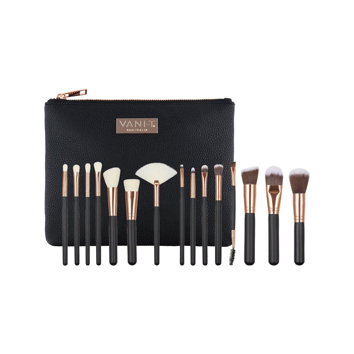 Add a touch of serious glam to your makeup toolkit with this must-have collection of 15 professional makeup brushes. Looking THE business in rose gold and black, jaws will drop when you whip out the ultra-chic faux leather zip clutch and reveal these do-it-all brushes.